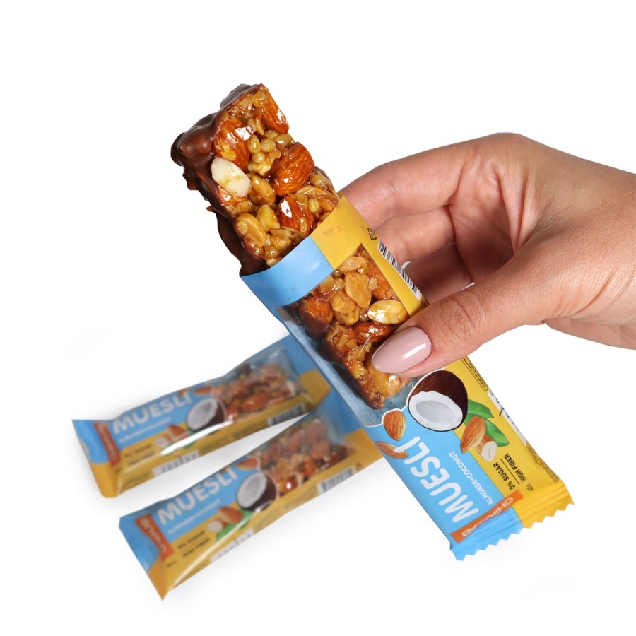 Состав- миндаль, кокос, молочный шоколад (водорастворимые волокна кукурузы, какао-масло, какао тёртое, молоко сухое обезжиренное, эмульгатор (соевый лецитин), ароматизаторы натуральные, подсластитель (сукралоза)), олигофруктоза (пищевые волокна), арахис, инулин(пищевые волокна), вода, кокосовое масло, рисовые шарики (рисовая мука, кукурузная крупа, соль), агент влагоудерживающий (глицерин), соль морская, ароматизаторы натуральные, эмульгатор (соевый лецитин), антиокислитель (аскорбиновая кислота), консервант (сорбат калия), натуральный подсластитель (стевиозид).