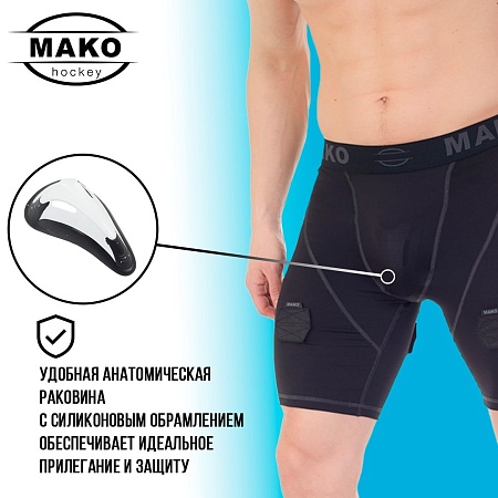 КОМПРЕССИОННЫЕ ШОРТЫ С РАКУШКОЙ МАКО - идеально подходит для интенсивных тренировок на льду Мужские компрессионные шорты с защитной раковиной и липучками для гамаш, анатомической плотной посадкой на теле. Дополнительную фиксацию шортам обеспечивает широкий эластичный пояс. Материалы: высококачественные материалы предоставляют комфортный контакт с кожей и не вызывают раздражения, а плоские швы исключают эффект натирания, эффективно испаряет влагу, сохраняя тело практически сухим, что позволяет двигаться в белье свободно и естественно. Компрессия: способствует улучшению кровоснабжения тканей, повышает работоспособность, снижает вероятность получения травм и обеспечивает более быстрое восстановление после интенсивных нагрузок. Состав: полиэстер 100%