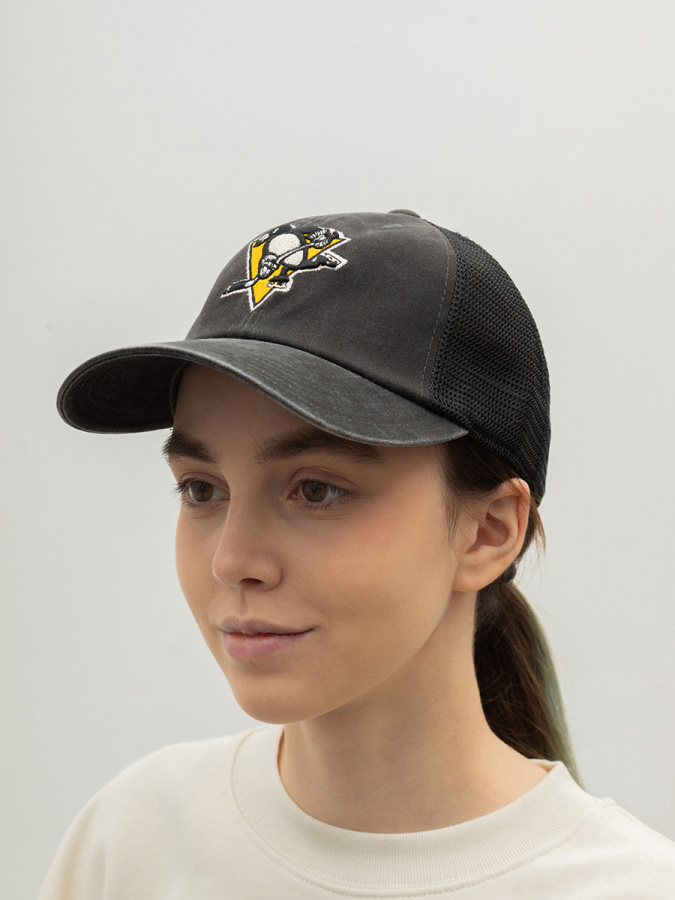 Американская бейсболка PITTSBURGH PENGUINS из серии Raglan Bones. Бейсболка сшита из черного состаренного хлопка. На передней панели вышита эмблема американского хоккейного клуба Питтсбург Пингвинз, созданного в 1967 году и играющего в НХЛ. На логотипе изображен пингвин на коньках с клюшкой на фоне золотого треугольника. Размер бейсболки регулируется с помощью текстильного ремешка с металлической пряжкой и кнопки. Комфортную носку в жаркий день обеспечивает сеточка и два люверса на передней панели. Длина козырька – 7 см, глубина – 11 см.