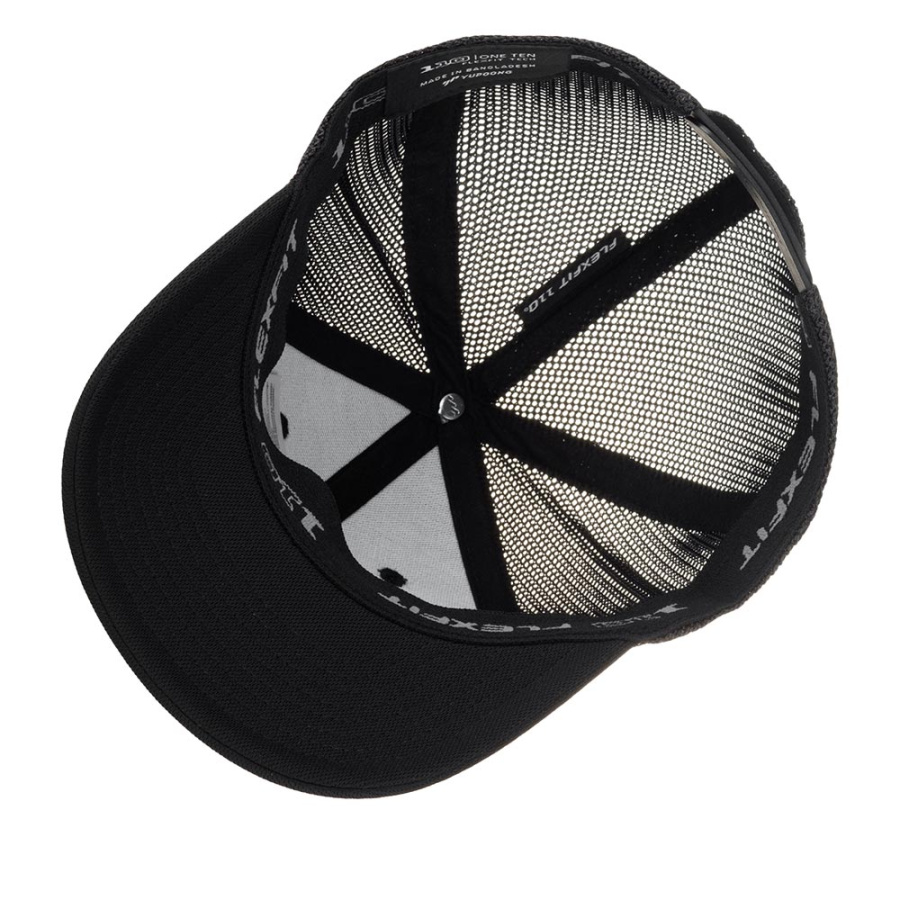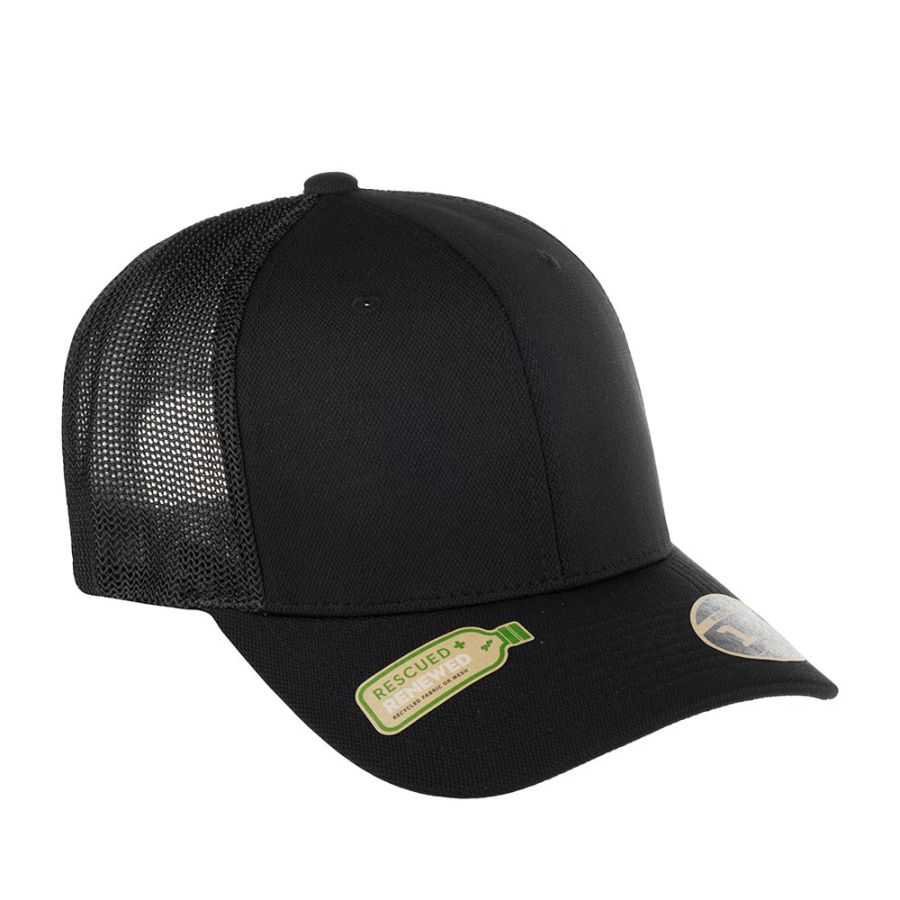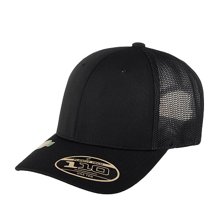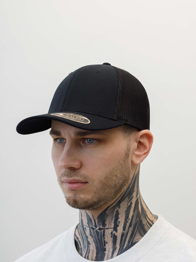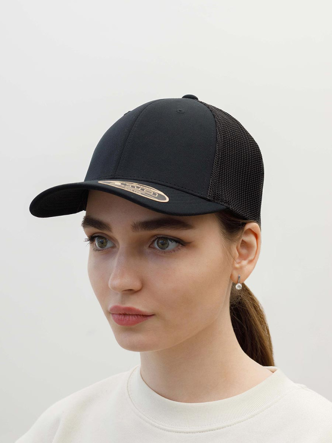 Черная бейсболка с твердой передней панелью, плотной сеточкой и чуть изогнутым козырьком от корейского бренда FLEXFIT. Модель выполнена из полиэстера, передняя панель и козырек имеют мягкую пористую фактуру. Создатели бренда не отстают от тенденции на экологичность и используют пластиковые бутылки в качестве перерабатываемого сырья для изготовления головных уборов. Из измельченного пластика делаются нити, а из них — ткань. Для вентиляции предусмотрены люверсы и сеточка. Внутри по окружности головы вшита фирменная эластичная лента для комфортной посадки. Модель сделана по запатентованной компанией особой технологии 110 (One Ten). Она названа в честь ее способности соответствовать десяти и всем промежуточным размерам, благодаря эластичной ленте и застежке. Длина козырька – 6,5 см, глубина – 12 см. Модель для активного lifestyle и базового гардероба. Стикер на козырьке можно отклеить.