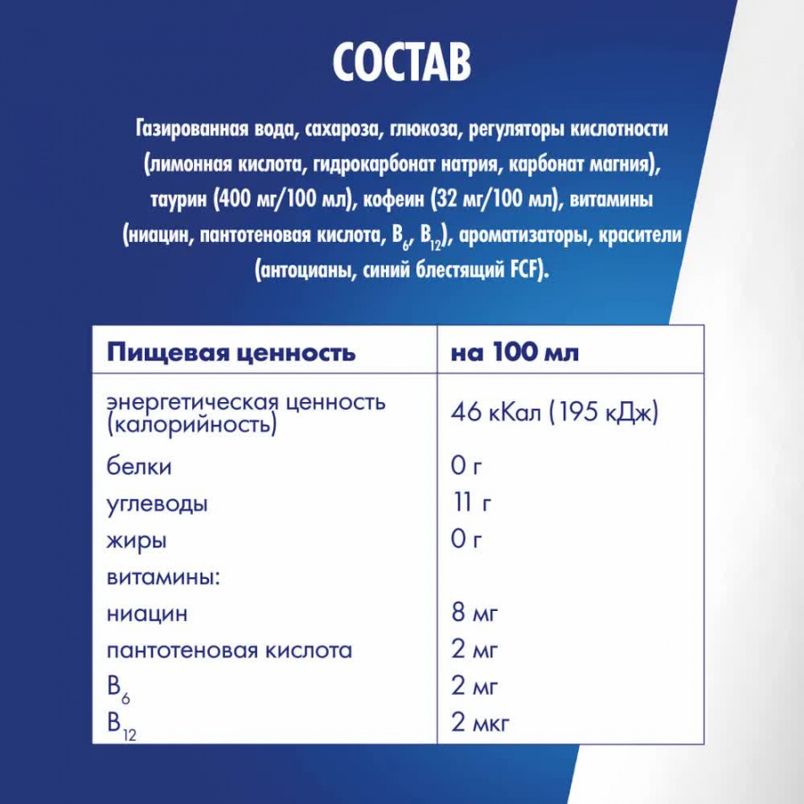 Предупреждение "Рекомендуемое суточное потребление не более одной банки. Употребить сразу после вскрытия банки. Употреблять охлажденным. Не рекомендуется употребление детьми в возрасте до 18 лет, при беременности и кормлении грудью, а также лицами, страдающими повышенной нервной возбудимостью, бессонницей, артериальной гипертензией." Условия хранения Хранить при температуре 0-25 °C. Состав Состав: газированная вода, сахароза, глюкоза, регуляторы кислотности (лимонная кислота, гидрокарбонат натрия, карбонат магния), таурин (400 мг/100 мл), кофеин (32 мг/100 мл), витамины (ниацин, пантотеновая кислота, В6, В12), ароматизаторы, красители (антоцианы, синий блестящий FCF).