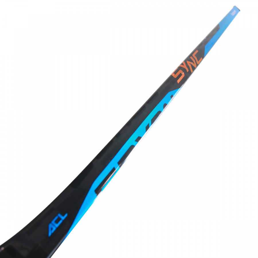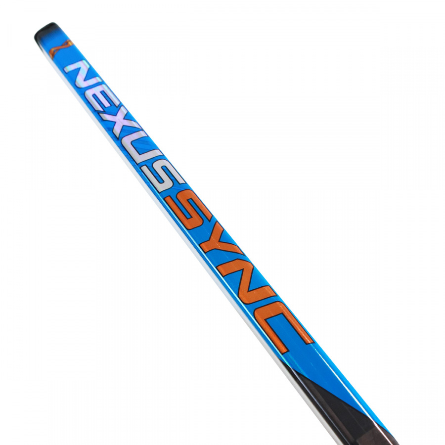 Представляем Nexus Sync. Эта клюшка заменит Nexus Geo — нашу топовую клюшку семейства Nexus. Если вы находитесь в торговом зале и разговариваете с игроком, заинтересованным в этой клюшке, мы хотим, чтобы вы запомнили три ключевых коммерческих свойства. Первое — это вес. По сравнению с Nexus Geo мы смогли уменьшить вес на 25 грамм. Клюшка для взрослых весит 365 грамм. Благодаря новой технологии ACL 2.0 мы можем уменьшить вес наших изделий. По сути, мы используем более тонкие слои высококачественного углеродного волокна на внутренней поверхности клюшки. Используя более тонкие слои, мы можем создавать точные сочетания слоев, позволяющие сократить вес не в ущерб долговечности этой клюшки. Возможность сократить вес на 25 граммов обеспечивает более динамичные и быстрые броски шайбы.