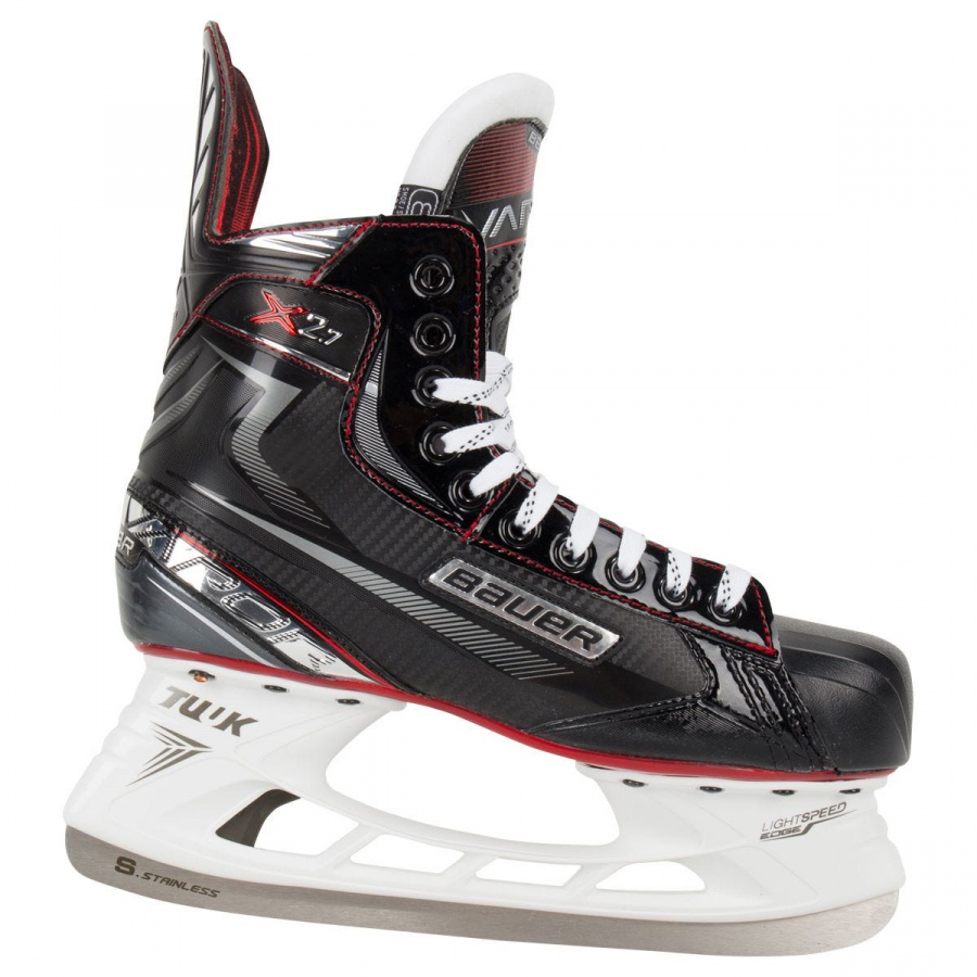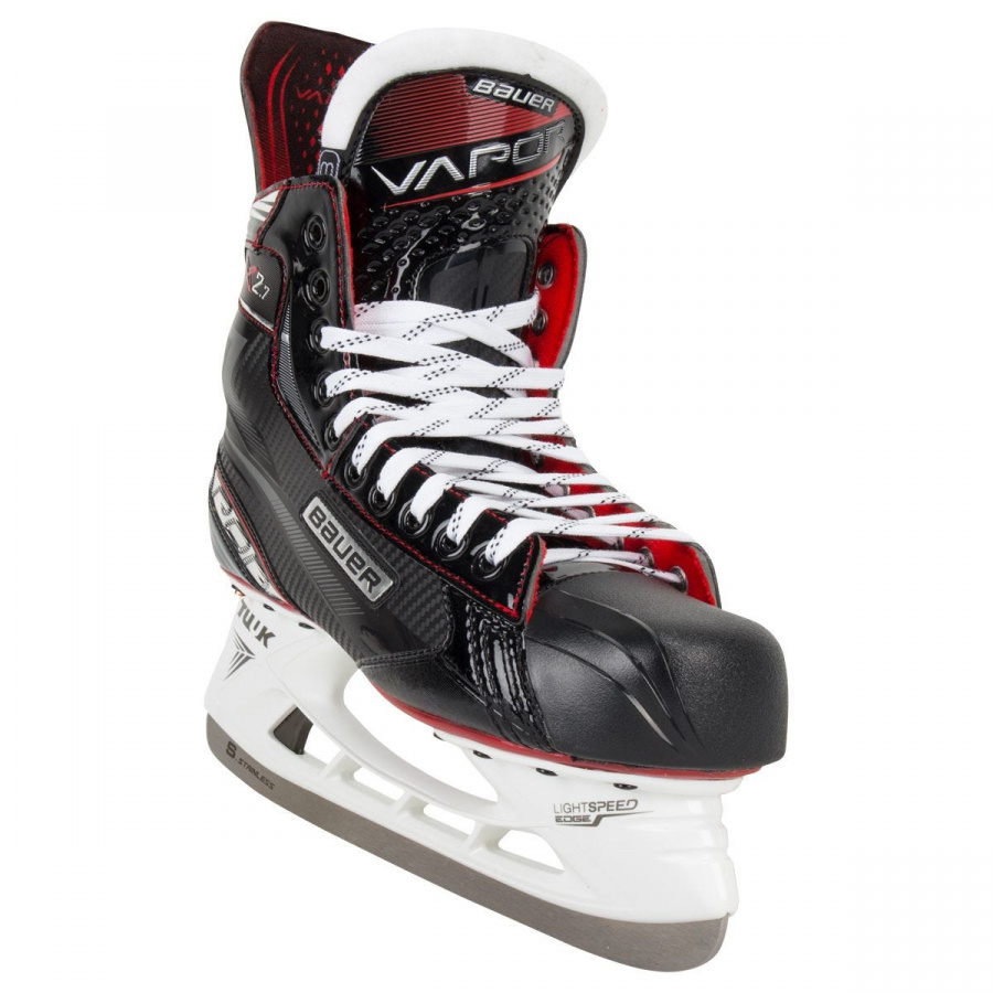 Коньки хоккейные BAUER VAPOR X2.7 S19 SR взрослые. Модель 2019 года, полупрофессионального уровня, коньки предназначены для любителей хоккея и профессиональных игроков. Спортивная обувь выполнена из тканого нейлона в классическом дизайне и традиционной контрастной расцветке. Для подошвы используется плотный двухслойный термоэластопласт, а для изготовления стакана и лезвия – нержавеющая сталь TUUK Lightspeed Pro.