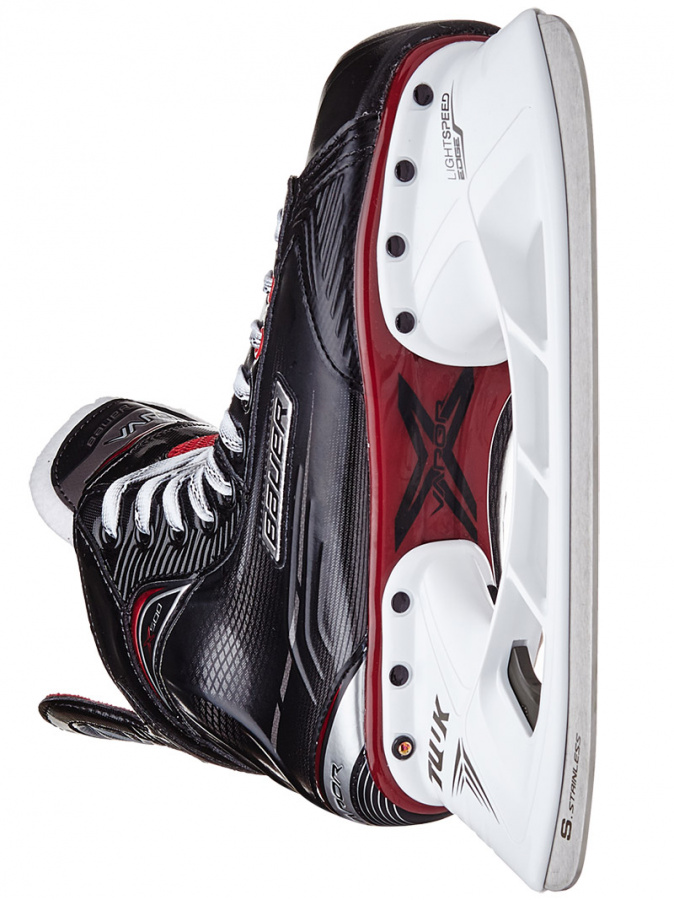 Коньки Bauer Vapor X500 разработаны для игроков среднего уровня подготовки. В отличие от более дешевых коньков у Vapor X500 применяются съемные лезвия из нержавеющей стали Tuuk в держателе Edge. Язык имеет традиционную войлочную подложку плотностью 40 унций с дополнительным слоем плотной пены для большего комфорта и максимального поглощения удара. Усиленная поддержка TrueForm Tech PU имеет невероятную жесткость и поддержку в коньках подобной ценовой категории. Ботинок конька полностью термоформируемый, что позволяет добиться максимально анатомичной подгонки. Обновленный дизайн X-Rib дает игроку лучшую стабильность и максимальную отзывчивость