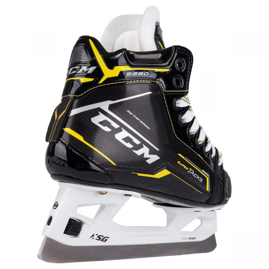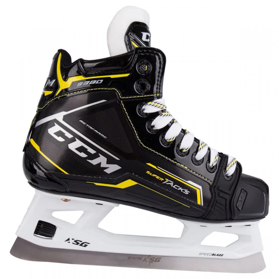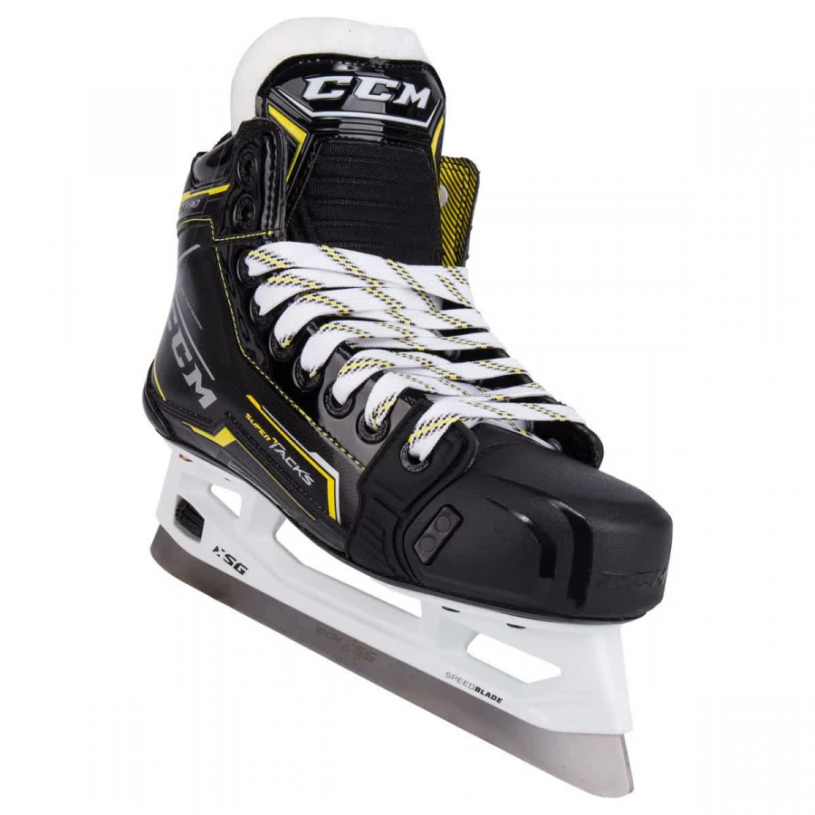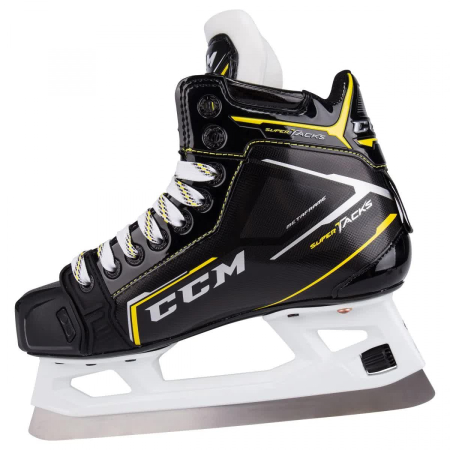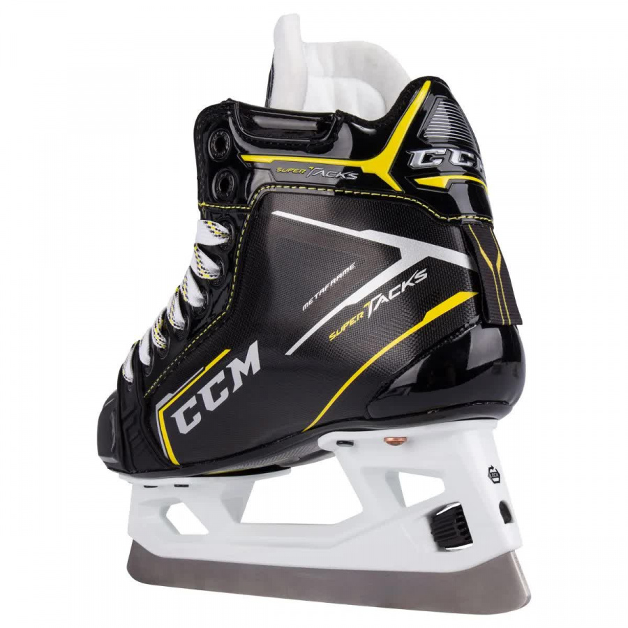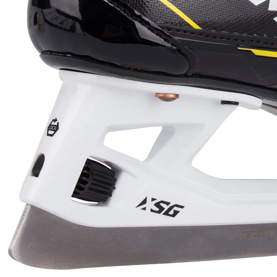 Внешний материал ботинка изготовлен из композитного материала ROCKETFRAME который сочетает в себе легкий вес и отличную защиту. Ассиметричная посадка позволяет вратарю играть в очень низкой стойке без какого-либо дискомфорта. В коньках используется язычок TRITECH FLEX с литой защитой который обеспечивает комфорт на протяжении всей игры. Внутренняя подкладка TOTALDRI LINER выполнена из влагопоглощающего материала которая помогает сохранять ноги сухими во время игры. Подошва конька изготовлена из тройного нейлона, который термоформуется для достижения максимального комфорта.