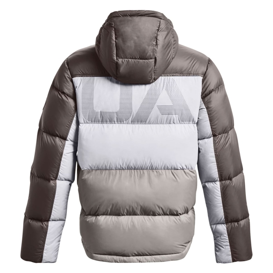 100% нейлон Ветро-влагозащитный материал Наполнитель: гусиный пух Технология UA Storm - защищает от непогоды, отталкивает воду при этом не жертвуя воздухопроницаемостью Технология ColdGear Infrared - это усовершенствованная технология ColdGear, оригинальный метод нанесения струйной печатью слоя керамики на внутреннюю поверхность тонких двухслойных изделий, позволяет быстрее прогревать воздушный слой под одеждой и дольше оставаться телу в тепле. Без увеличения веса и объема экипировки Два кармана на груди на молнии Боковые карманы на молнии