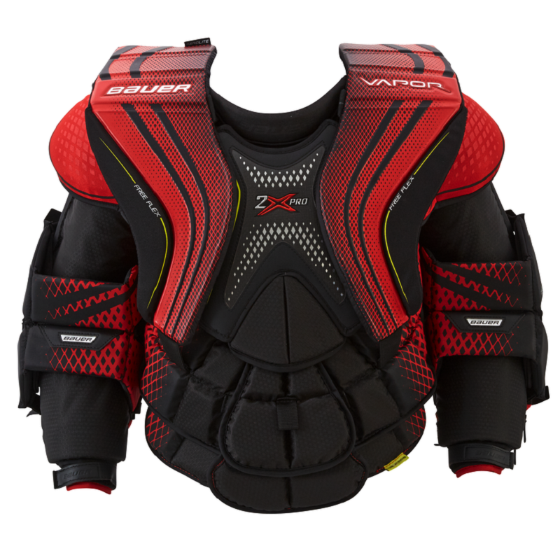 Нагрудник вратарский BAUER VAPOR 2X PRO S19 SR новинка сезона 2019, модель профессионального уровня, одна из самого совершенного и технологически продвинутого защитного снаряжения. Предлагаемая модель отличается качественной конструкцией и материалами, отличными защитными свойствами, великолепной мобильностью и сниженным весом. Материалом внешней отделки является высокопрочный нейлон, сетка и полиэстер Ripstop. Фронтальная панель нагрудника имеет мульти сегментное строение, где используются анатомически расположенные блоки, что позволяет вратарю свободно сгибаться и двигаться. Пена высокой плотности используется в передней панели в качестве амортизирующего наполнения и создает высокий уровень защиты. Центральный щиток, закрывающий грудину, дополнен вставкой Curv Composite, чтобы обеспечить дополнительную защиту для вратаря и контролировать отскок шайбы. Область плеча и ключиц закрыты дополнительными, навесными элементами с конструкцией Free Flex, которая облегчает перекрестные движения рук. Пена высокой плотн