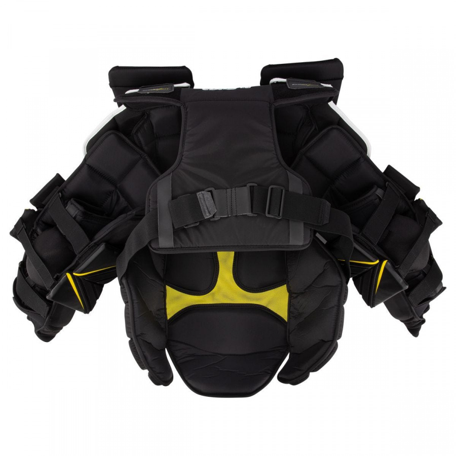 Модель обладает легкостью и обеспечивает высокий уровень защиты и свободу движения. Передняя панель нагрудника имеет мультисегментную конструкцию, которая позволяет вратарю свободно и легко сгибаться и двигаться. Область грудины защищена вставкой, которая выполнена из пены PE, обладающей высокой ударной прочностью и отличной амортизацией. В качестве амортизирующего наполнения во всех сегментах защиты, закрывающих тело вратаря со всех сторон, используется пена EPP, которая эффективно противодействует механическим нагрузкам, устойчива к разрушению, быстро восстанавливает свою первоначальную форму. Область плеча и ключиц закрыта дополнительными элементами, которые имеют регулируемую конструкцию Quick-Release Velcro Adjustment, и с помощью застежек-липучек можно подобрать удобную посадку и подгонку элементов защиты по фигуре вратаря. Плечевая чаша выполнена из формованной пены высокой плотности, обеспечивая эффективную защиту плеча.