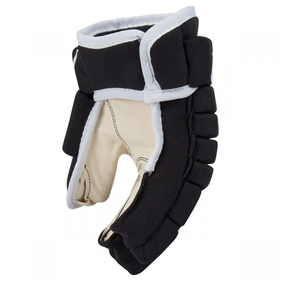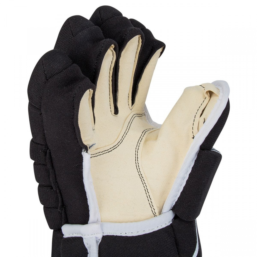 Модель имеет удобную посадку. Перчатки выполнены из высококачественного полиэстера стойкого к истиранию. Внутреннее, амортизирующее наполнение выполнено из легкой и прочной пены. Легкая сегментированная конструкция тыльной стороны кисти и пальцев имеет с защиту Pro-уровня. Открытая манжета гарантирует свободу движения руки в запястье и эффективную защиту. Ладонь перчатки дает игроку отличную чувствительность, обладает хорошим сцеплением с клюшкой, благодаря высокопрочному материалу, а также не поглощает влагу и имеет высокую стойкость к истиранию.