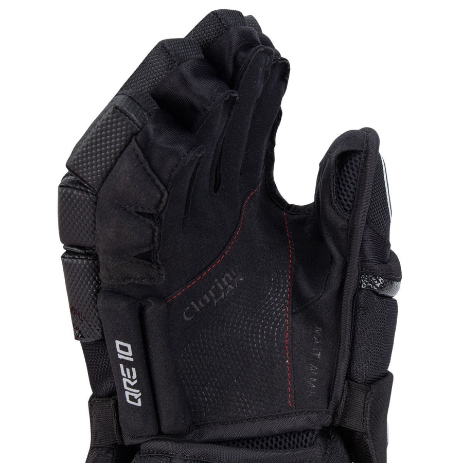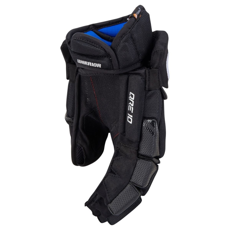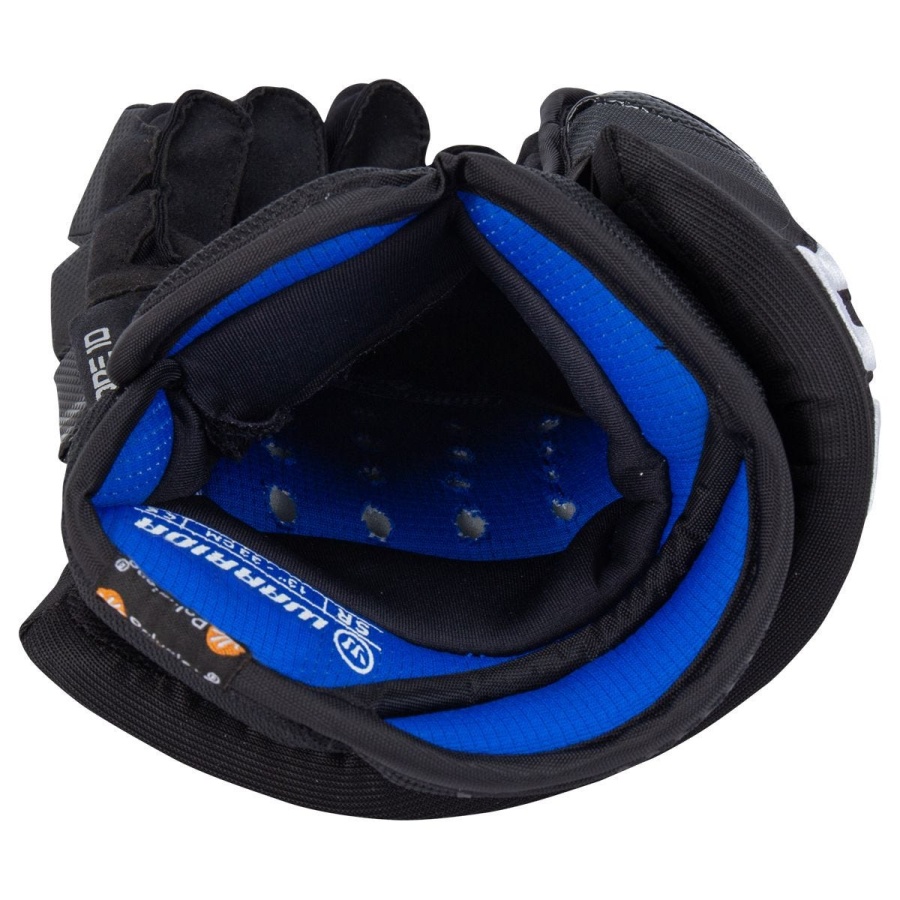 Перчатки Warrior COVERT QRE 10 SR. Внешняя отделка выполнена из синтетического материала DynaMesh и нейлона TuffTek 2.0 и обладает высокой прочностью и долговечностью. Тыльная часть перчаток и защита пальцев выполнена из стандартной пены. Все пальцы разрезаны на два защитных сегмента. Защита большого пальца имеет однокомпонентную конструкцию и выполнена из формованного пластика, который покрыт пеной стандартной плотности. Между пальцами вшиты эластичные вставки. Внутренняя подкладка и WarTech FNC хорошо отводит влагу. Ладонь перчатки выполнена из синтетического материала Clarino, который отличается высокой износоустойчивостью и обладает отличным сцеплением с клюшкой. Коническая посадка повторяет естественную форму запястья, что гарантирует максимальную мобильность и защиту.