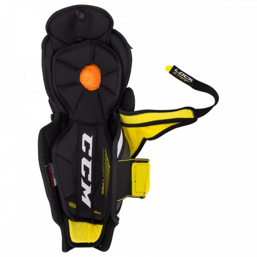 Щитки хоккейные CCM SUPER TACKS SR взрослая, профессиональная модель имеет низкопрофильный корпус с рельефным дизайном и образует надежную защиту, увеличивает мобильность. Съемная защита бедра имеет регулируемую конструкцию и выполнена из сегментированной пены средней плотности, которая усилена пластиковой вкладкой. Коленная чаша из формованного пластика выполнена с применением технологии Joint Discharge Principle (JDP), в результате чего происходит перераспределение силы удара от сустава на соседние мышцы. Использование пены D3O Smart Foam и пены высокой плотности в коленной чаше позволяет получить высокий уровень защиты. Элементы защиты боковой части колена так же выполнены с использованием пены D3O Smart Foam. Анатомически сформованный элемент защиты икроножной мышцы выполнен из пены высокой плотности и пены средней плотности и дополнен пеной D3O Smart Foam. Съемный анатомический вкладыш имеет амортизирующее наполнение из пены средней плотности. Его сегментированное строение точно повторяет контур голени,
