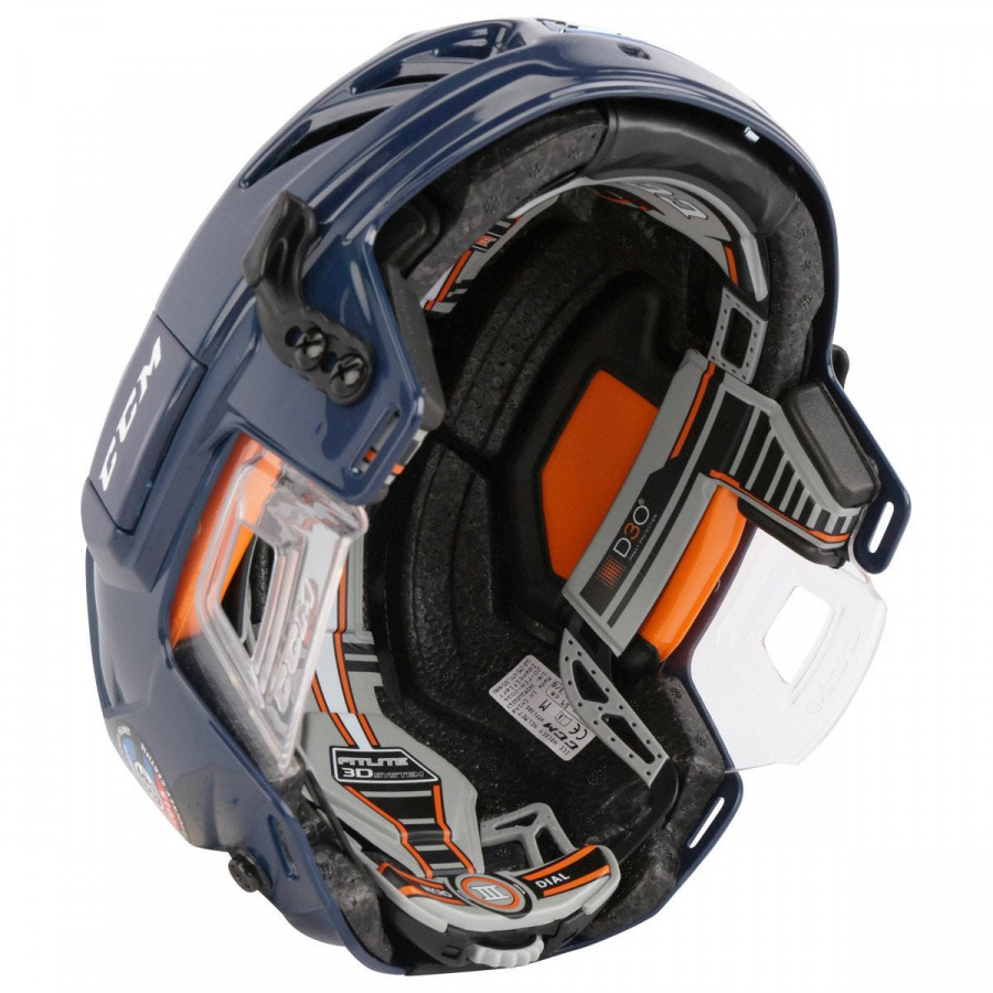 Шлем хоккейный CCM FITLITE 3DS SR новая модель профессионального уровня обладает превосходной посадкой и высоким уровнем защиты, а так же имеет абсолютно новый дизайн. Двухсоставной корпус шлема выполнен из материала PE высокой плотности и имеет субоболочку, выполненную из ABS-пластика, что обеспечивает высокую ударную прочность корпуса. Базовый вкладыш изготавливается из пены EPP средней плотности. В процессе исследований производитель пришел к выводу, что в отличие от традиционной пены EPP высокой плотности эта пена с более низкой плотностью лучше поглощает энергию удара, поэтому в данной модели используется именно пена EPP средней плотности. В ключевых точках, контактирующих с головой хоккеиста, основной вкладыш покрыт пеной, которая обладает эффектом памяти, что обеспечивает мягкий контакт и комфорт без снижения защитных свойств шлема. Расположенная в области висков пена D3O Smart Foam имеет высокую степень поглощения силы удара и значительно снижает его возде