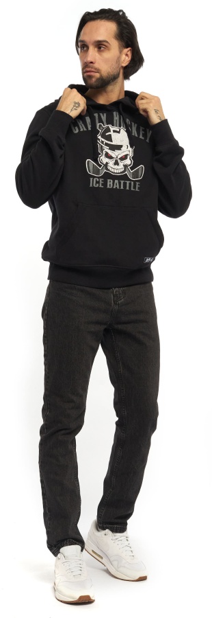 Классическая Толстовка Crazy Hockey с мягкой внутренней стороной и капюшоном. Детали: прямой крой, капюшон со шнуровкой, карман-кенгуру, широкие эластичные резинки по низу и на манжетах. Состав: 60% хлопок, 40% полиэстер. Цвет: Чёрный. Элементы: Печать с винтажным эффектом.