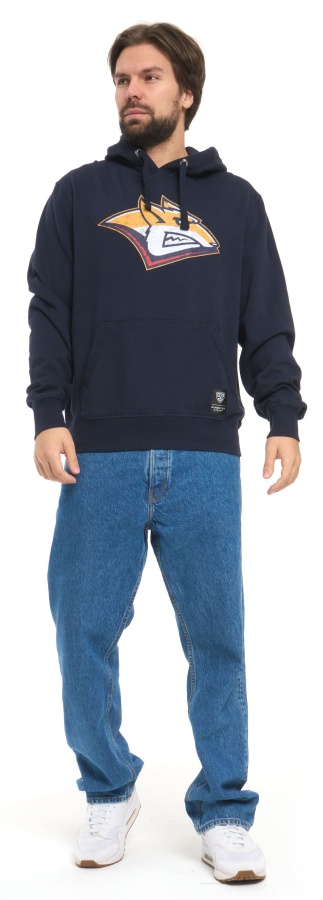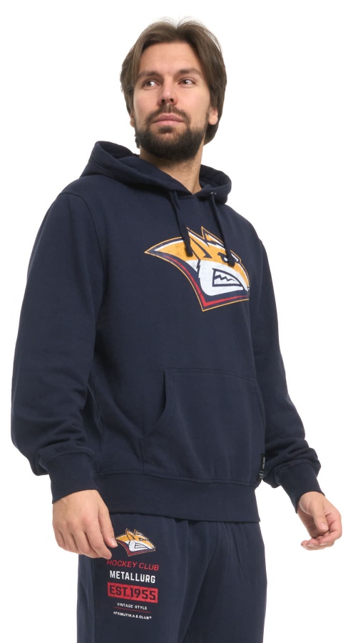 Классическая Толстовка ХК Металлург Магнитогорск с мягкой внутренней стороной и капюшоном. Детали: прямой крой, капюшон со шнуровкой, карман-кенгуру, широкие эластичные резинки по низу и на манжетах. Состав: 60% хлопок, 40% полиэстер. Элементы: Печать с винтажным эффектом.