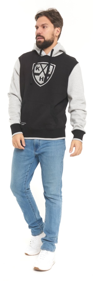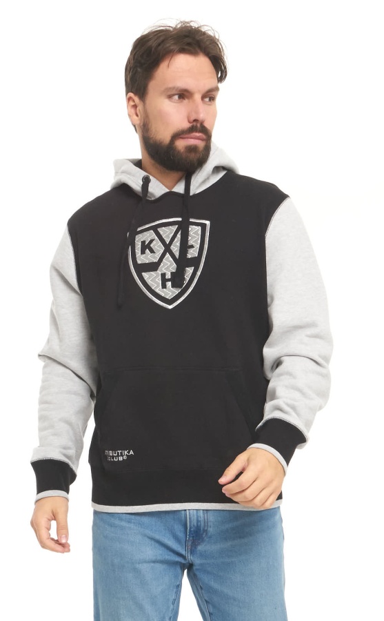 Классическая Толстовка КХЛ с мягкой внутренней стороной и капюшоном с подкладкой. Детали: флисовая подкладка, прямой крой, капюшон со шнуровкой, карман-кенгуру, широкие эластичные резинки по низу и на манжетах. Состав: 72% хлопок, 28% полиэстер. Элементы: Объемная вышивка.