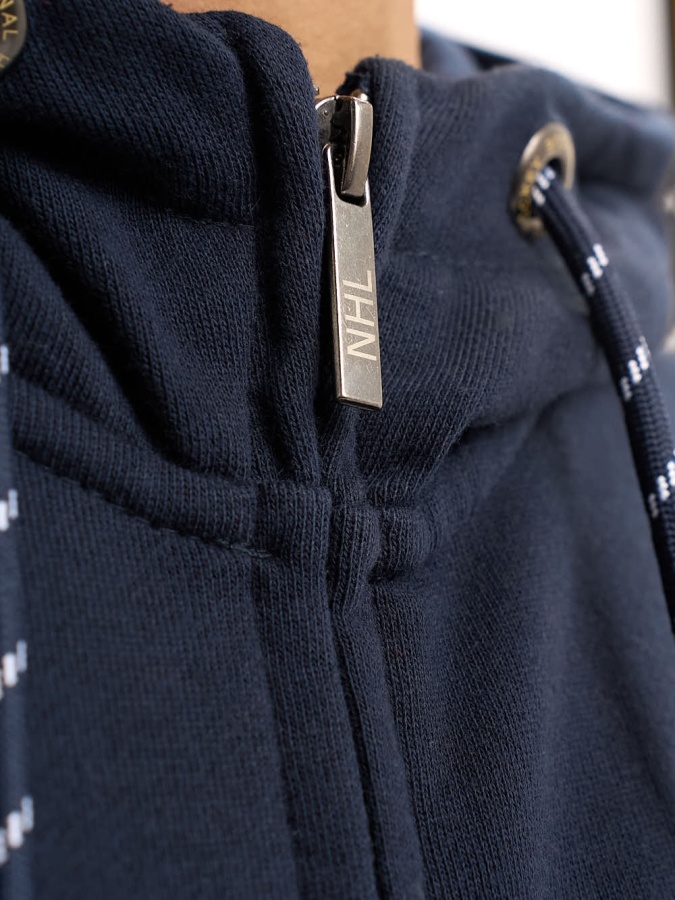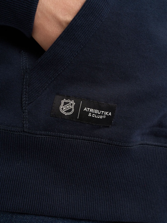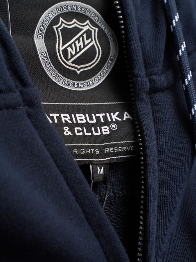 Толстовка NHL Washington Capitals на молнии, с капюшоном выполнена из трикотажа френч-терри. На груди расположен вышитый клубный логотип. Производитель: Atributika&Club Состав: 65% хлопок, 35% полиэстер. Цвет: Темно-синий. Элементы: вышивка логотипа. Параметры модели: рост 180 см, обхват груди 86 см, талия 70 см, размер одежды 46-48. На модели надет размер: S