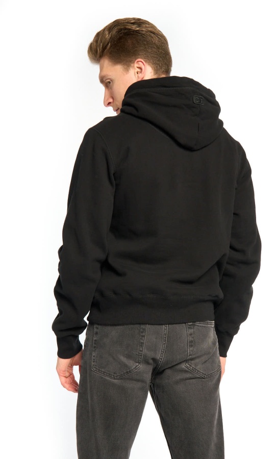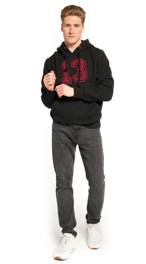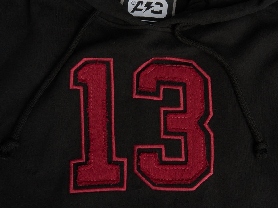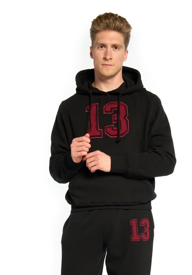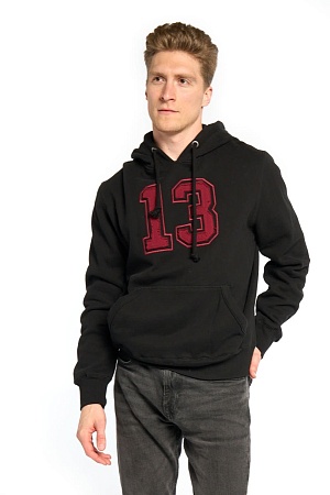 Толстовка № 13 из плотного смесового трикотажа. Детали: прямой крой, карман-кенгуру и одношовный капюшон, широкие эластичные резинки по низу и на манжетах. Состав: 80% хлопок, 20% полиэстер. Элементы: принт на груди в виде винтажной аппликации, на капюшоне – оригинальный фирменный лейбл Atributika&Club. Цвет: Чёрный